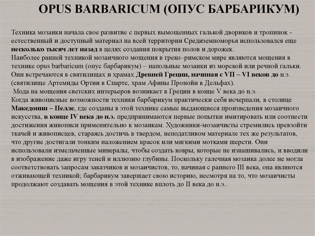 OPUS BARBARICUM (ОПУС БАРБАРИКУМ)Техника мозаики начала свое развитие с первых вымощенных галькой двориков и тропинок естественный и доступный материал на всей территории Средиземноморья использовался еще