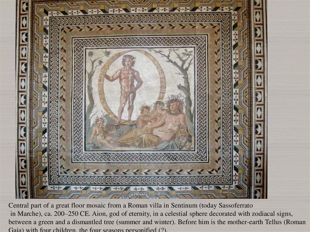 Central part of a great floor mosaic from a Roman villa in Sentinum (today Sassoferratoin Marche), ca. 200–250 CE. Aion, god of eternity, in a celestial sphere decorated with zodiacal signs,