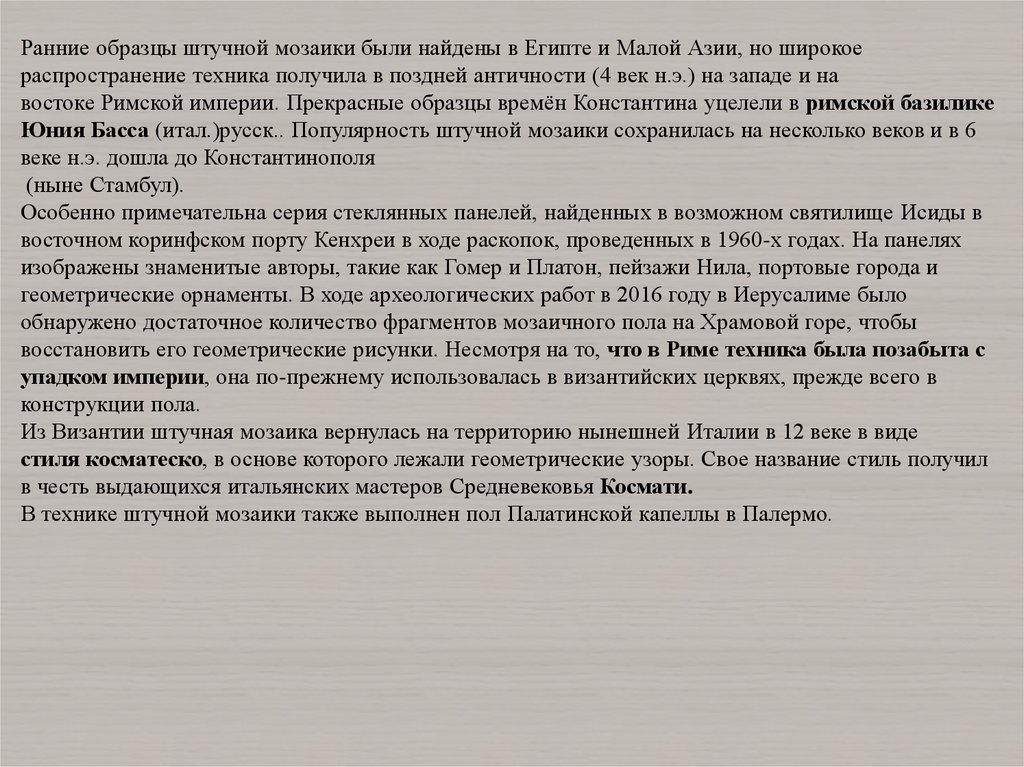 Наиболее ранней техникой мозаичного мощения в греко–римском мире являются мощения в