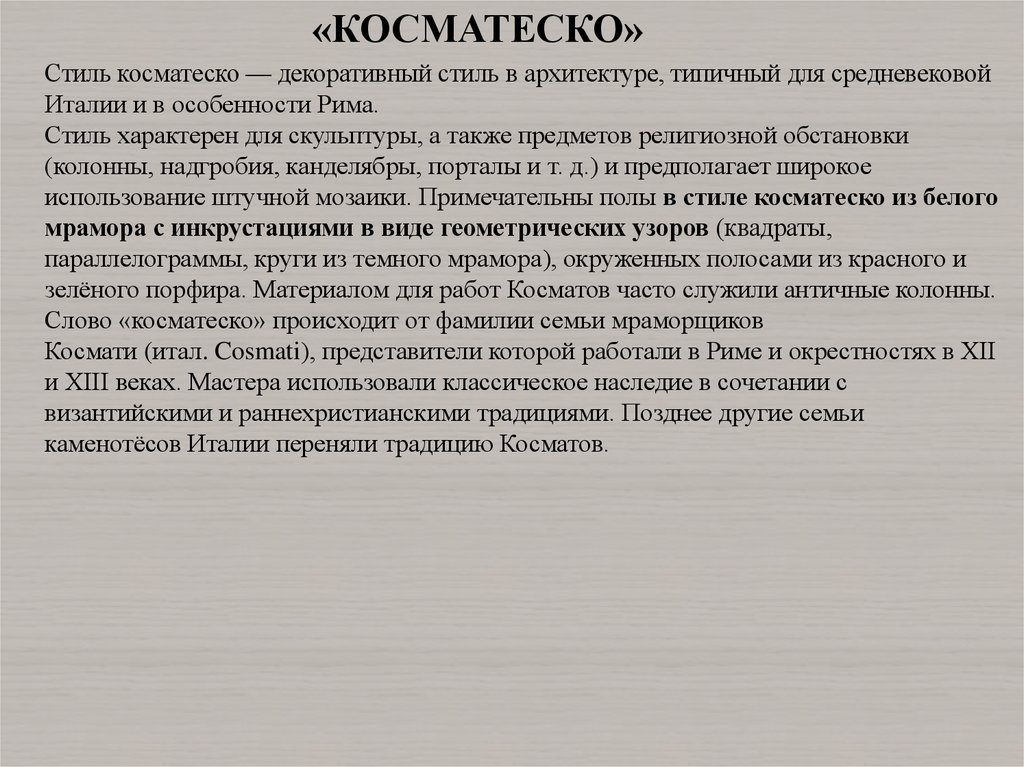 «КОСМАТЕСКО»Стиль косматеско — декоративный стиль в архитектуре, типичный для средневековой