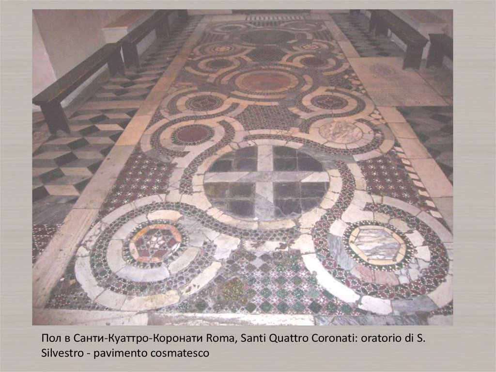 использование штучной мозаики. Примечательны полы в стиле косматеско из белого