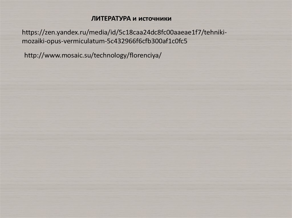 ЛИТЕРАТУРА и источникиhttps://zen.yandex.ru/media/id/5c18caa24dc8fc00aaeae1f7/tehnikimozaiki-opus-vermiculatum-5c432966f6cfb300af1c0fc5