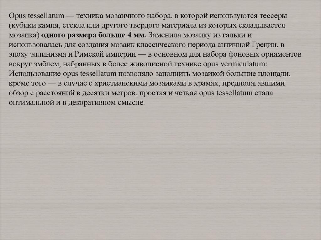 Opus tessellatum — техника мозаичного набора, в которой используются тессеры(кубики камня, стекла или другого твердого материала из которых складывается