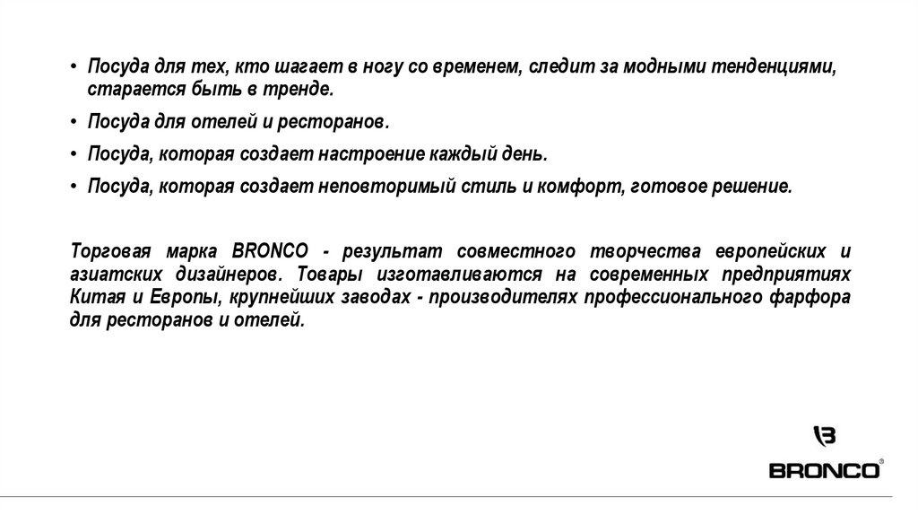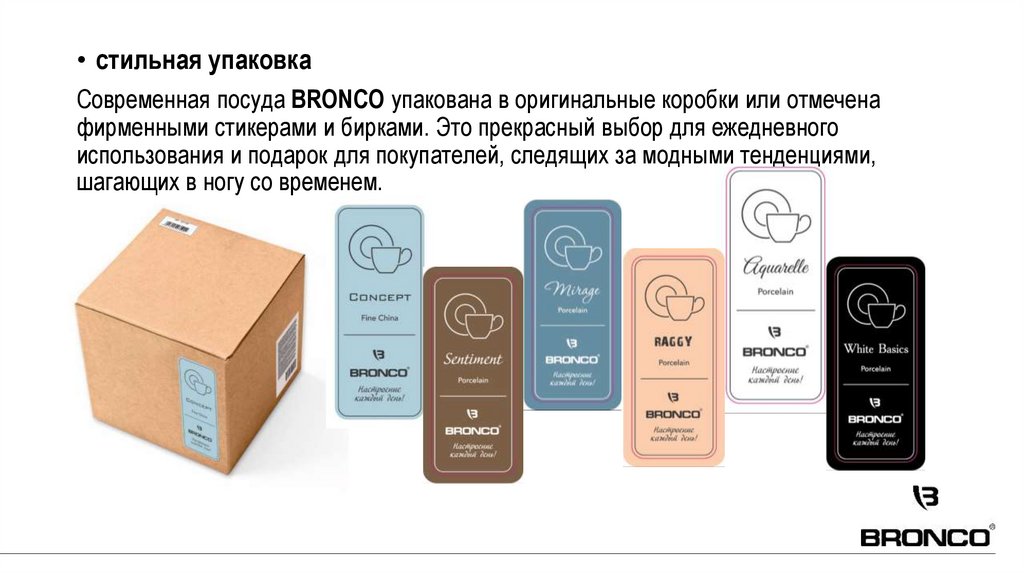 • стильная упаковкаСовременная посуда BRONCO упакована в оригинальные коробки или отмечена