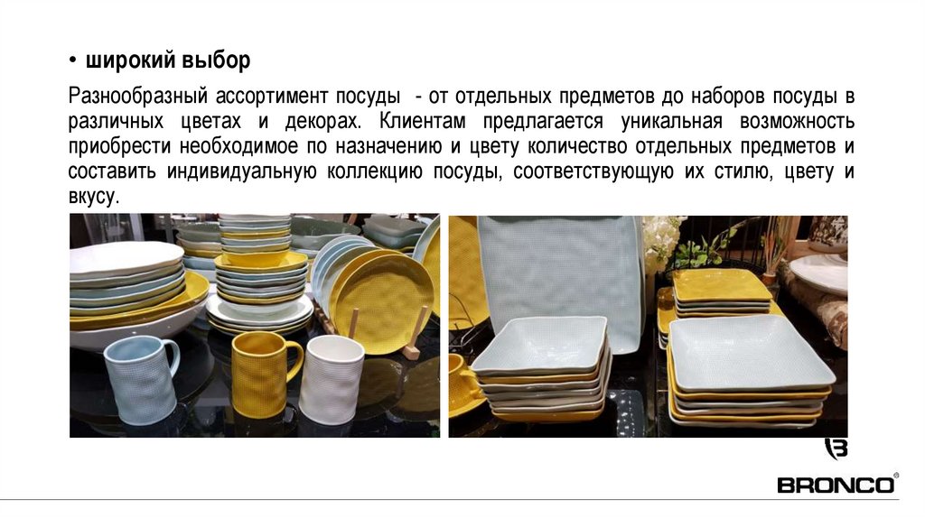 • широкий выборРазнообразный ассортимент посуды - от отдельных предметов до наборов посуды в