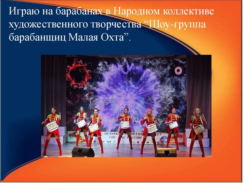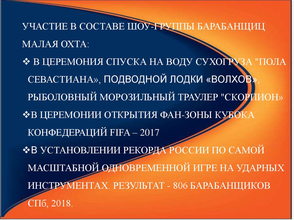 УЧАСТИЕ В СОСТАВЕ ШОУ-ГРУППЫ БАРАБАНЩИЦМАЛАЯ ОХТА: