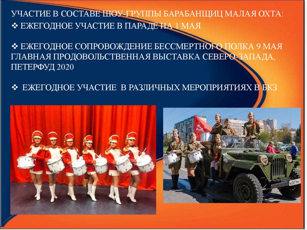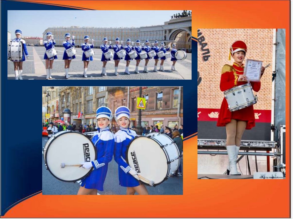 УЧАСТИЕ В СОСТАВЕ ШОУ-ГРУППЫ БАРАБАНЩИЦ МАЛАЯ ОХТА:ЕЖЕГОДНОЕ УЧАСТИЕ В ПАРАДЕ НА 1 МАЯ