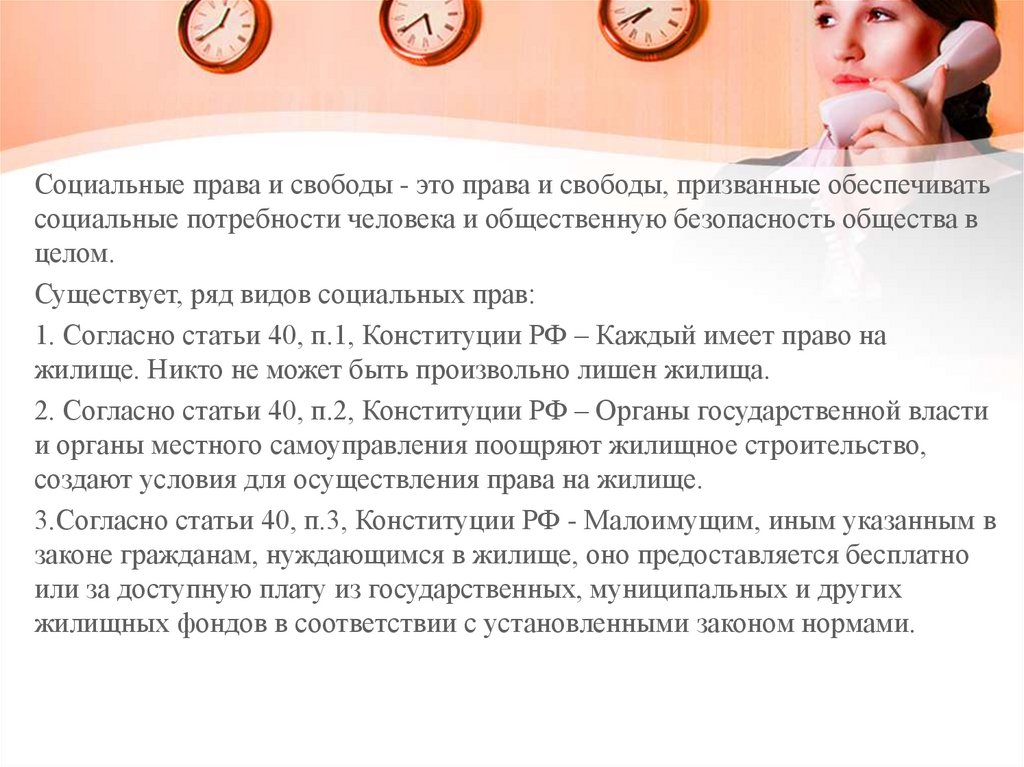 Социальные права и свободы - это права и свободы, призванные обеспечиватьсоциальные потребности человека и общественную безопасность общества в