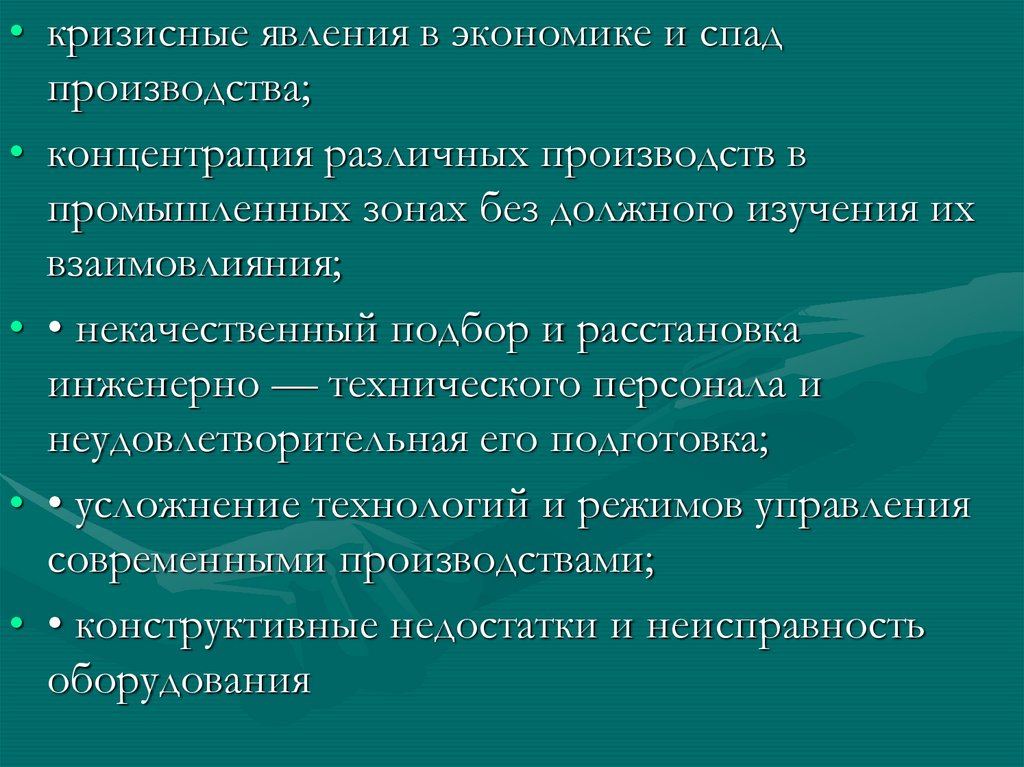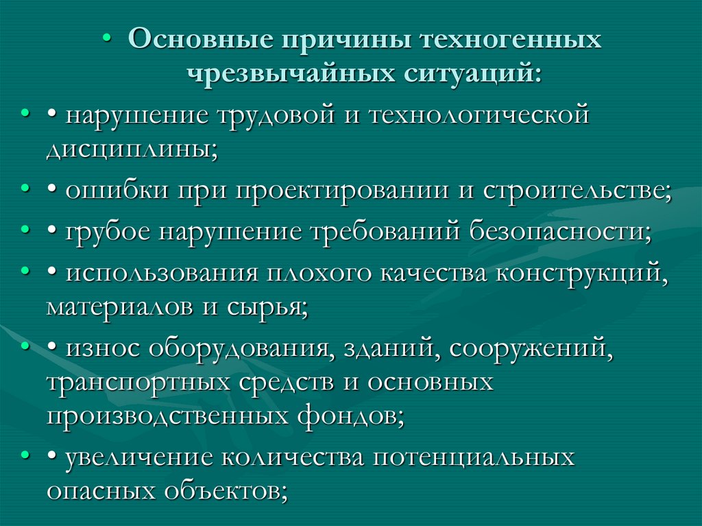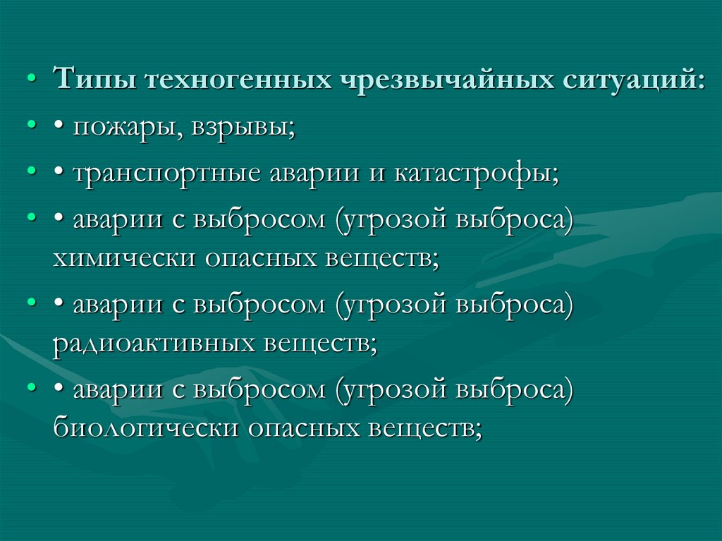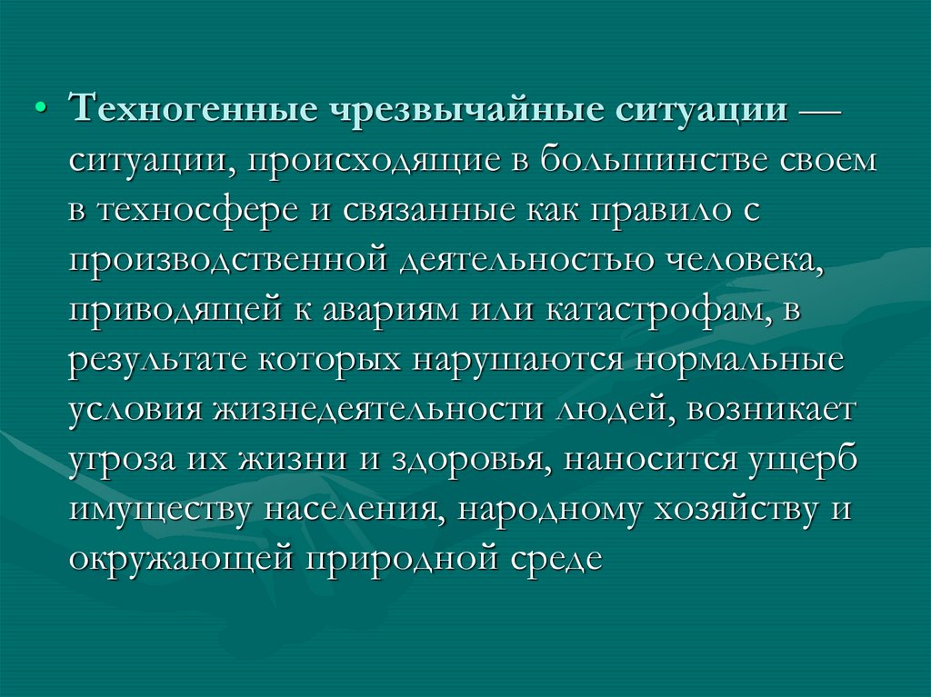• Техногенные чрезвычайные ситуации —ситуации, происходящие в большинстве своем