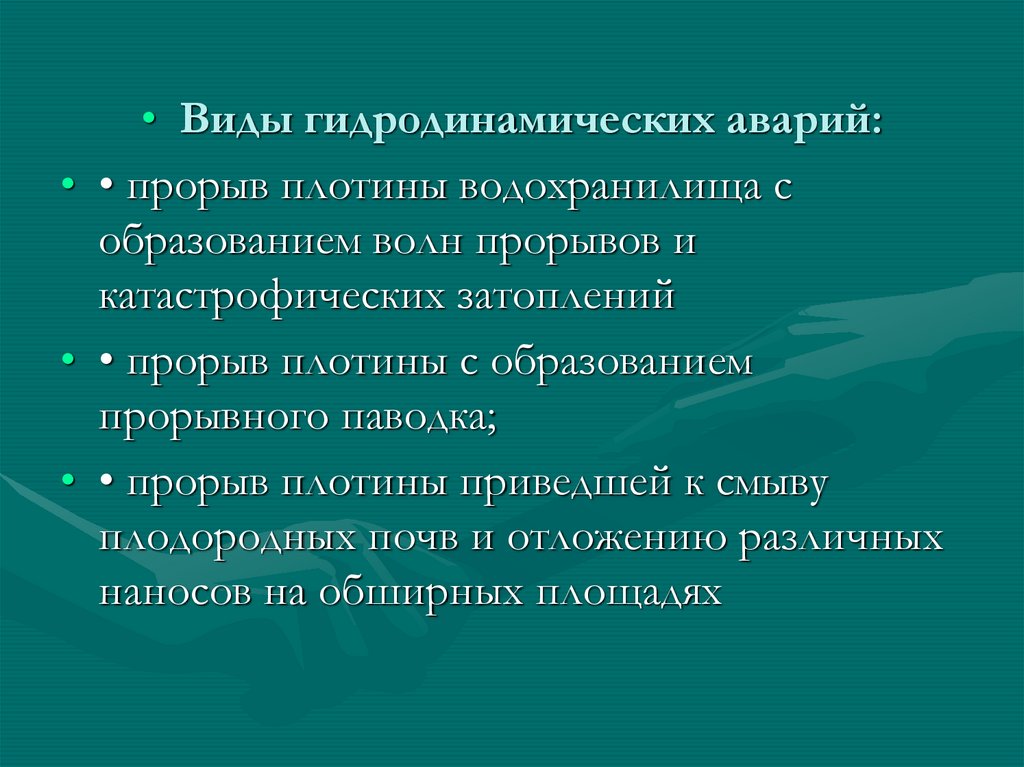• Виды гидродинамических аварий:• • прорыв плотины водохранилища с