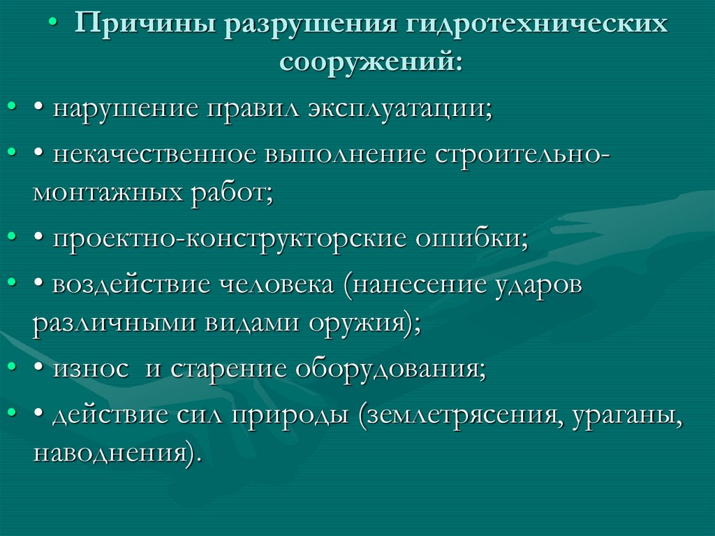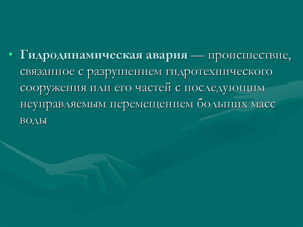 • Гидродинамическая авария — происшествие,связанное с разрушением гидротехнического