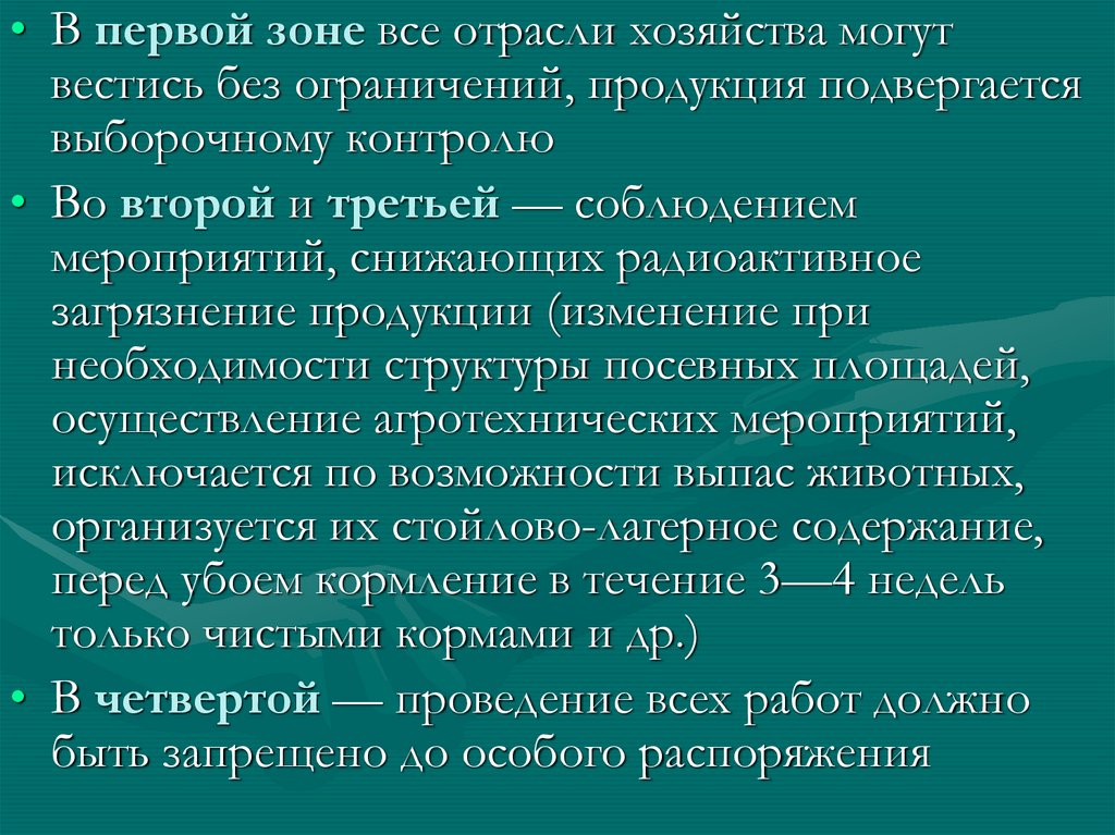 • В первой зоне все отрасли хозяйства могутвестись без ограничений, продукция подвергается