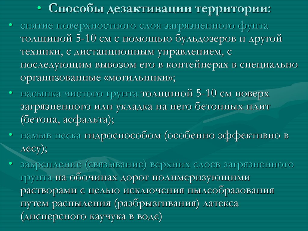 • Способы дезактивации территории:• снятие поверхностного слоя загрязненного фунта