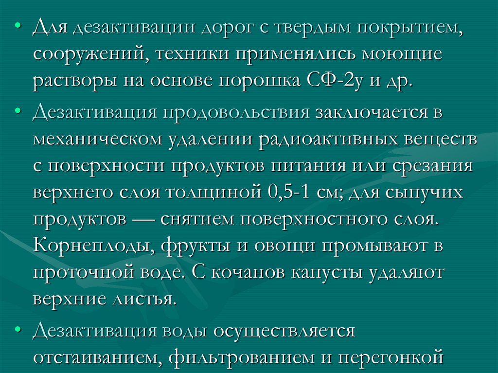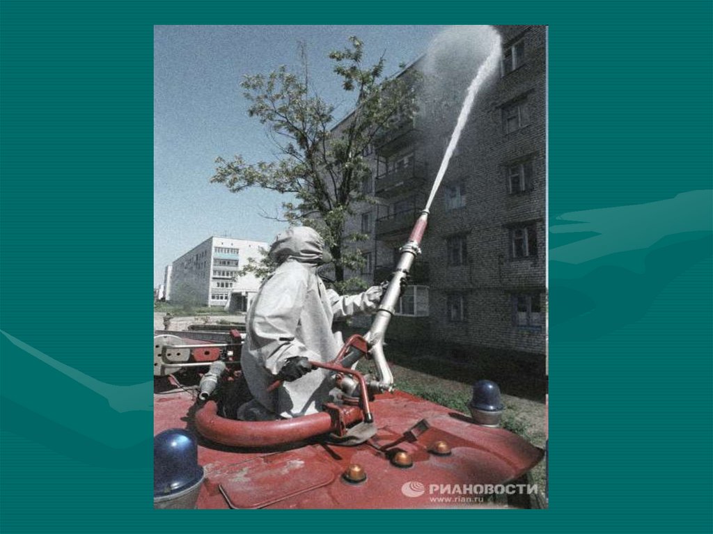 • Для дезактивации дорог с твердым покрытием,сооружений, техники применялись моющие