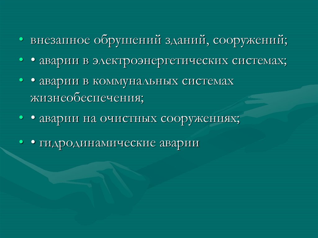 • внезапное обрушений зданий, сооружений;• • аварии в электроэнергетических системах;