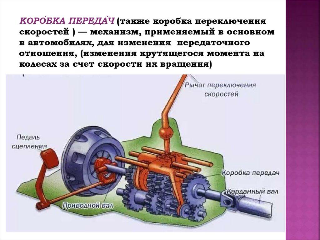 КОРО́БКА ПЕРЕДА́Ч (также коробка переключенияскоростей ) — механизм, применяемый в основном