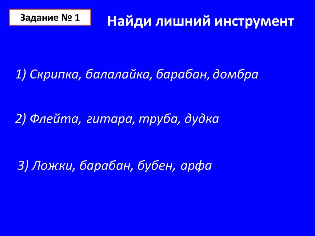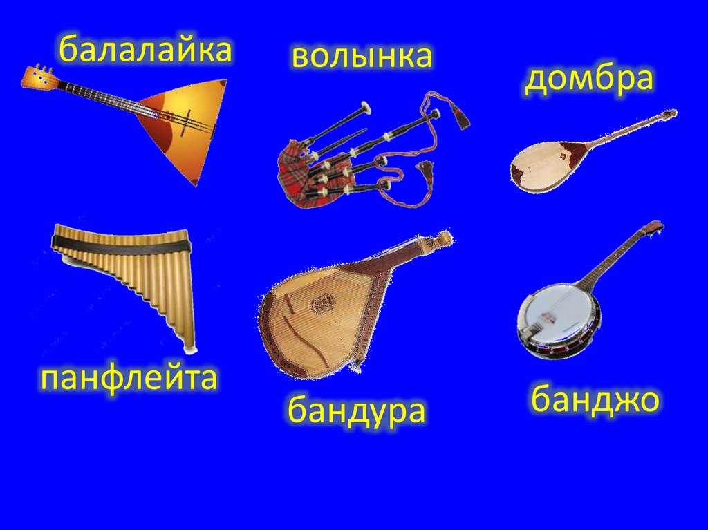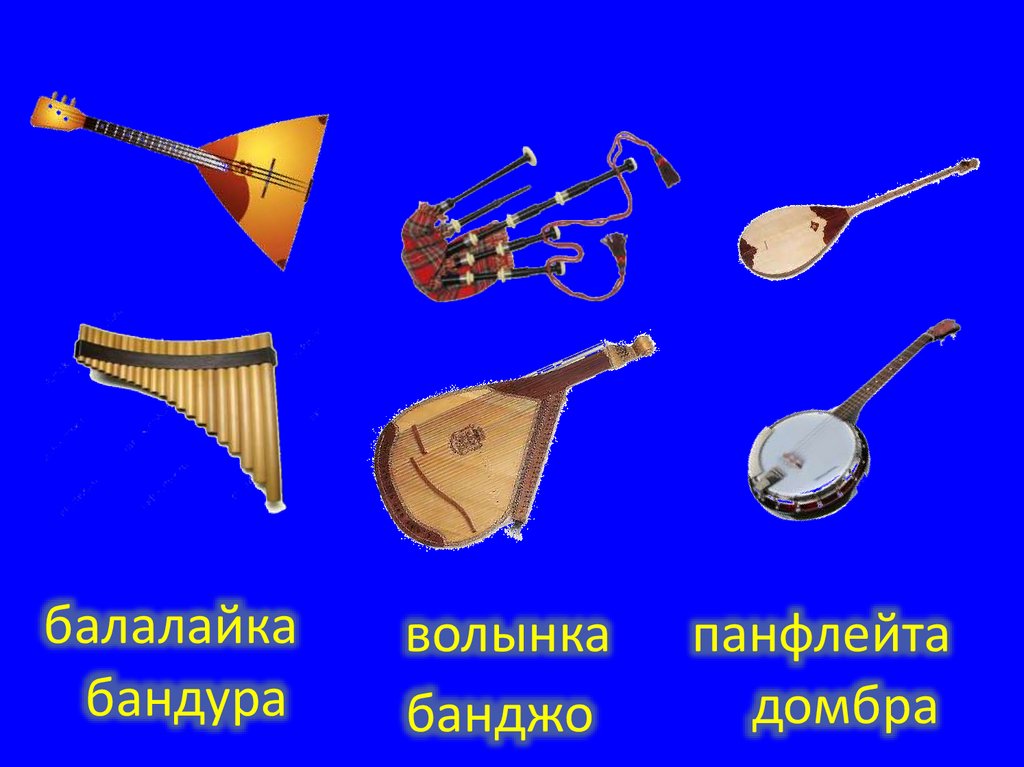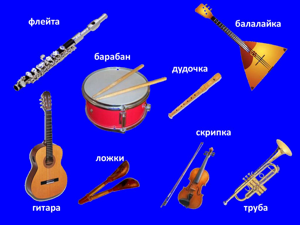Бубен, труба, скрипка, ложки, домбра, барабан