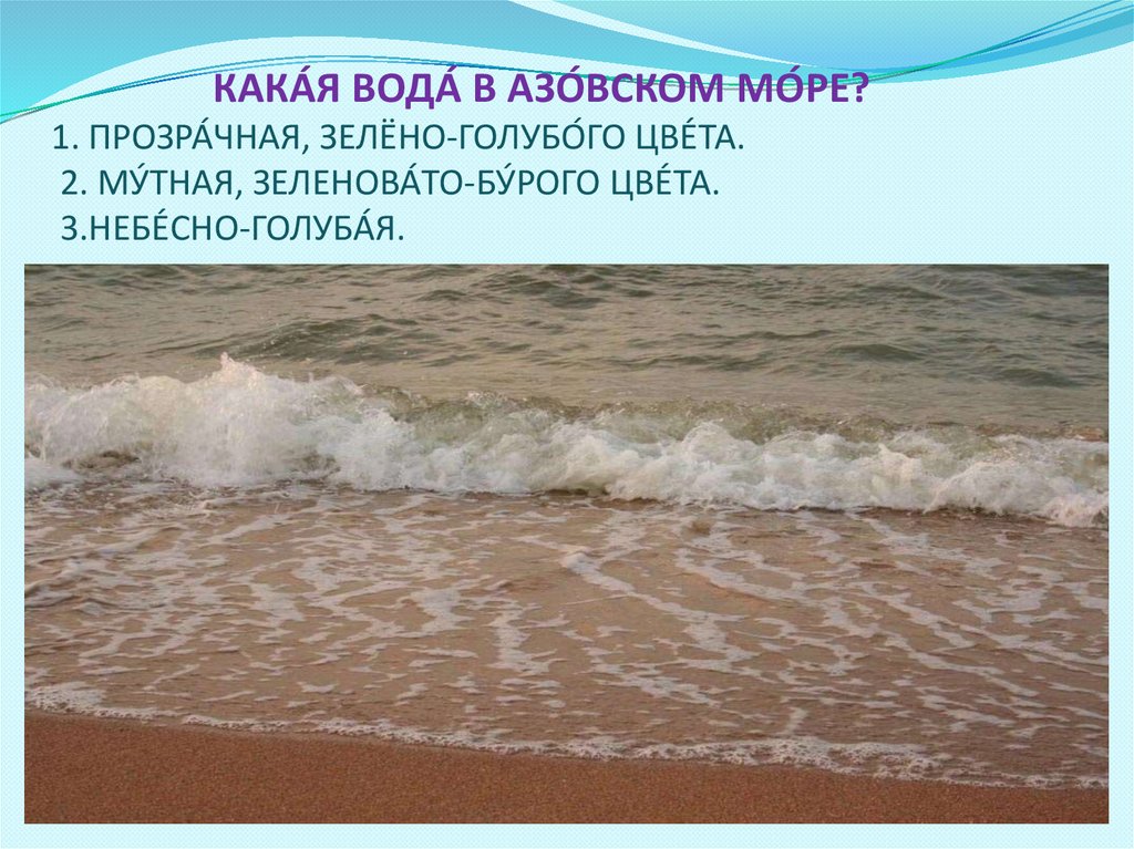 3.НЕБЕ́СНО-ГОЛУБА́Я.2. КАКА́Я ВОДА́ В АЗО́ВСКОМ МО́РЕ? 1. ПРОЗРА́ЧНАЯ, ЗЕЛЁНО-ГОЛУБО́ГО ЦВЕ́ТА. 2. МУ́ТНАЯ, ЗЕЛЕНО́ВАТО-БУ́РОГО ЦВЕ́ТА.