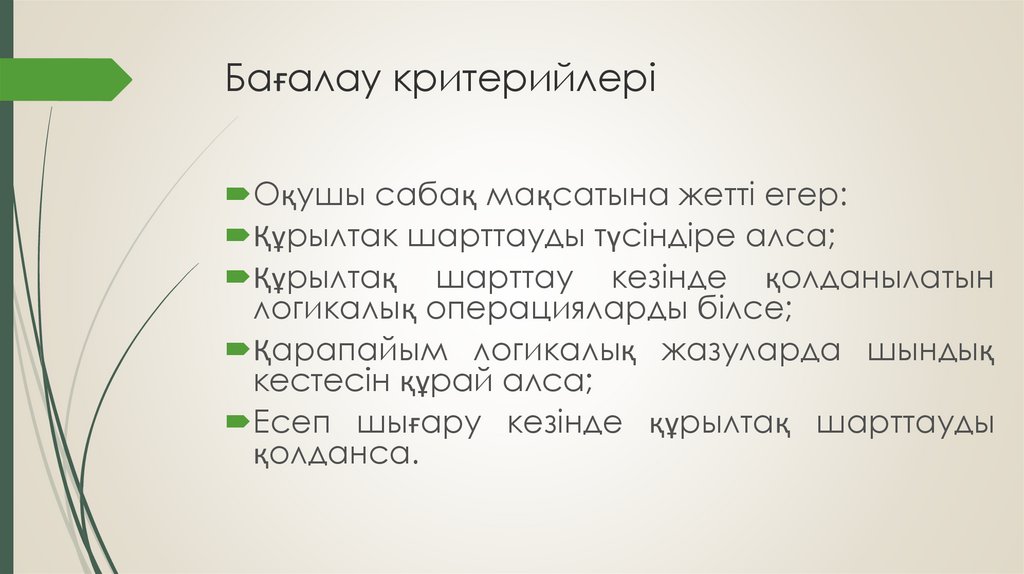 Оқушы сабақ мақсатына жетті егер:Құрылтак шарттауды түсіндіре алса;