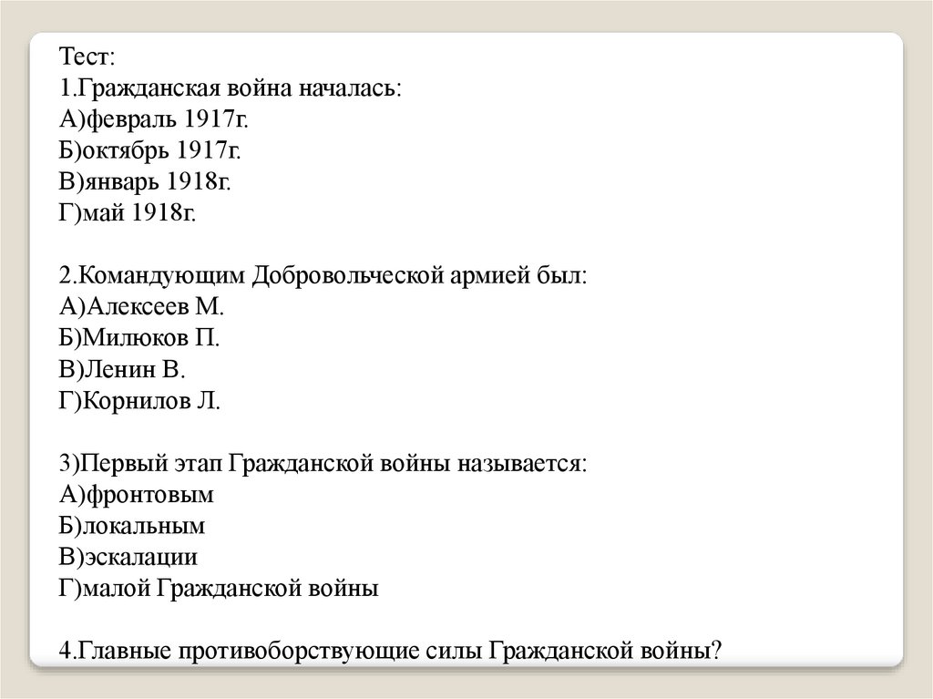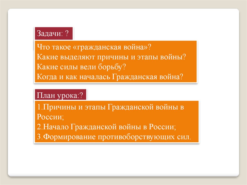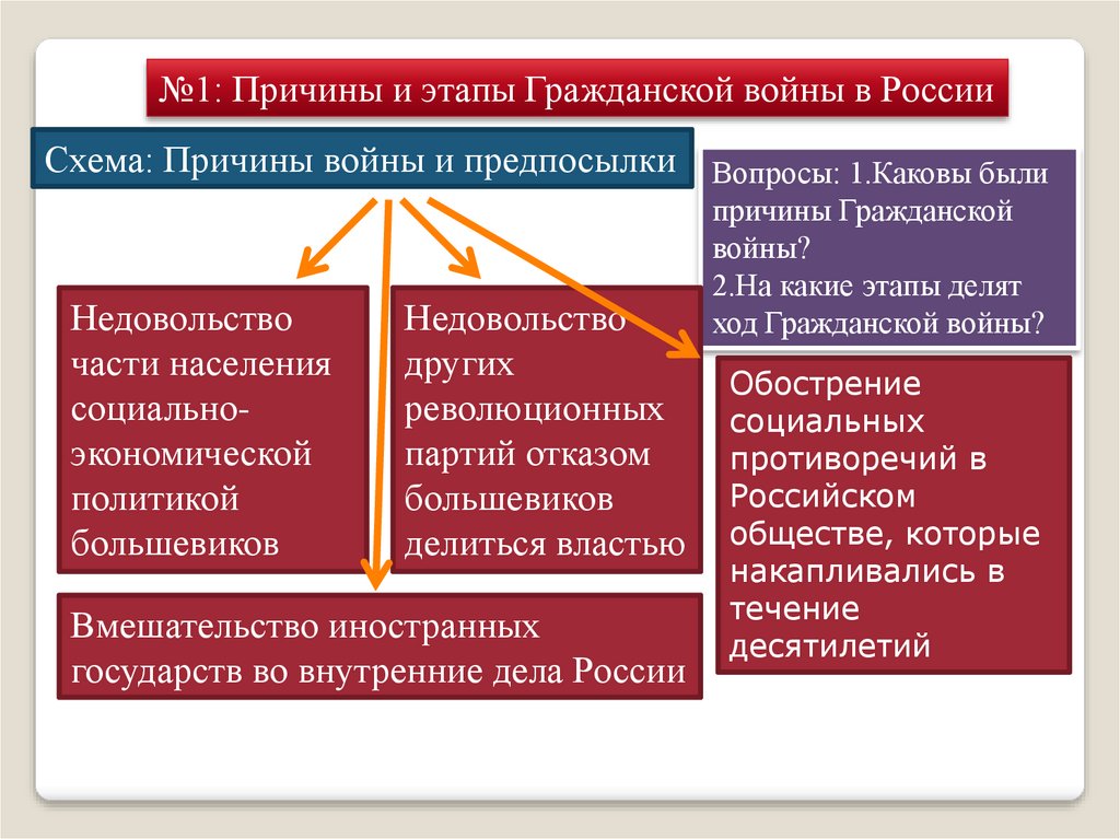 №1: Причины и этапы Гражданской войны в РоссииСхема: Причины войны и предпосылки Вопросы: 1.Каковы были