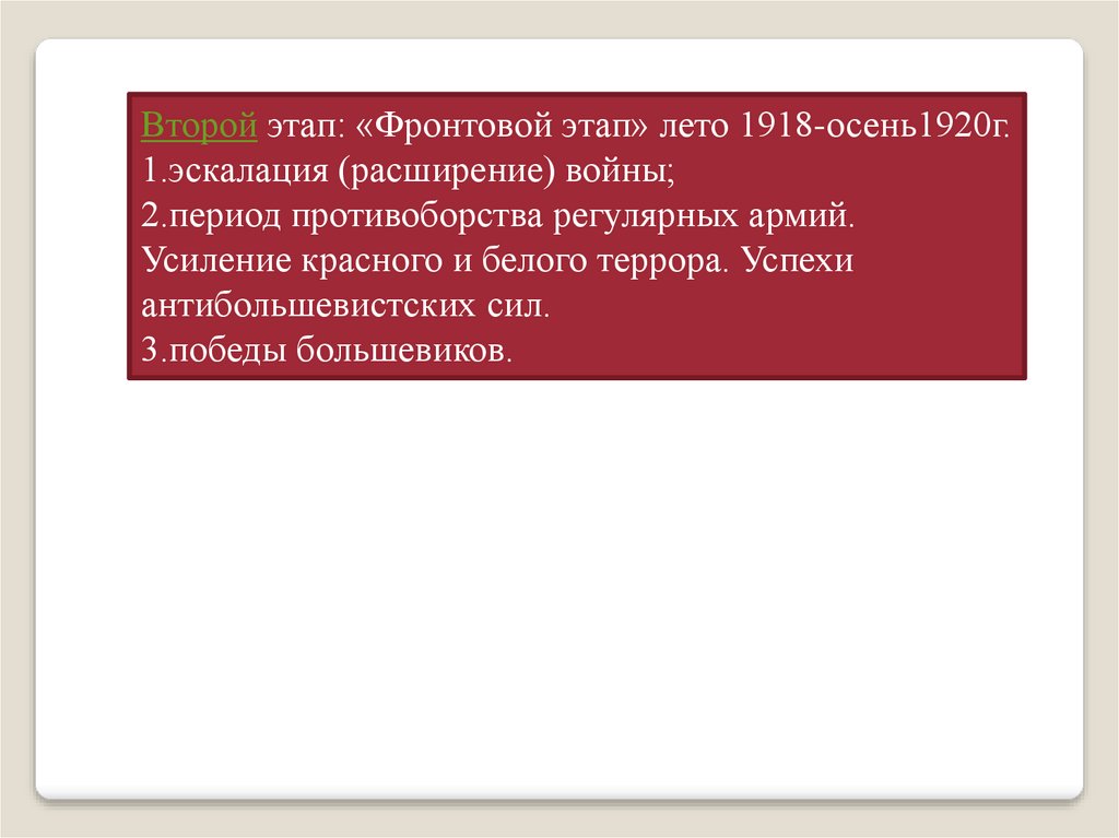 Второй этап: «Фронтовой этап» лето 1918-осень1920г.1.эскалация (расширение) войны;