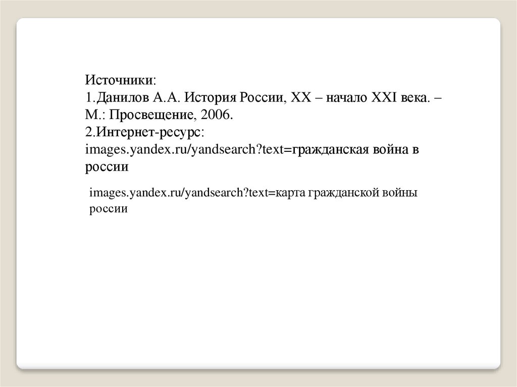 Источники:1.Данилов А.А. История России, XX – начало XXI века. –