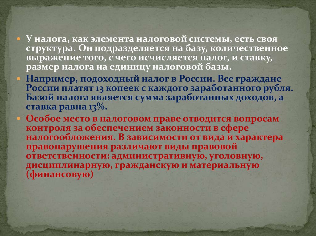 У налога, как элемента налоговой системы, есть свояструктура. Он подразделяется на базу, количественное