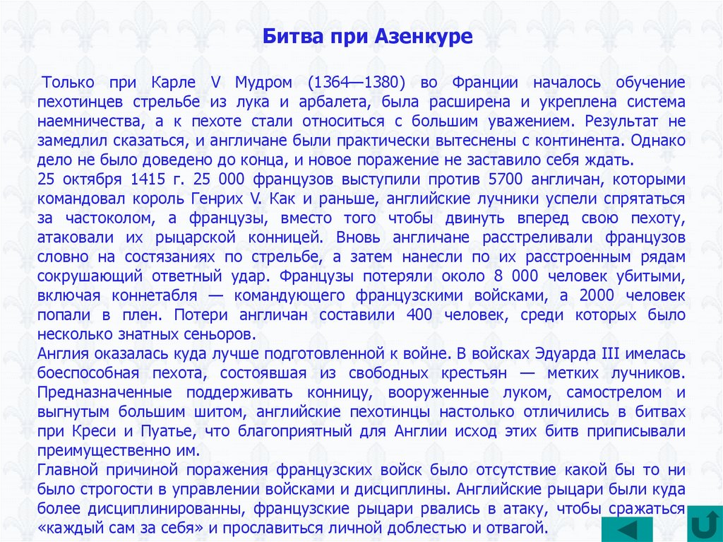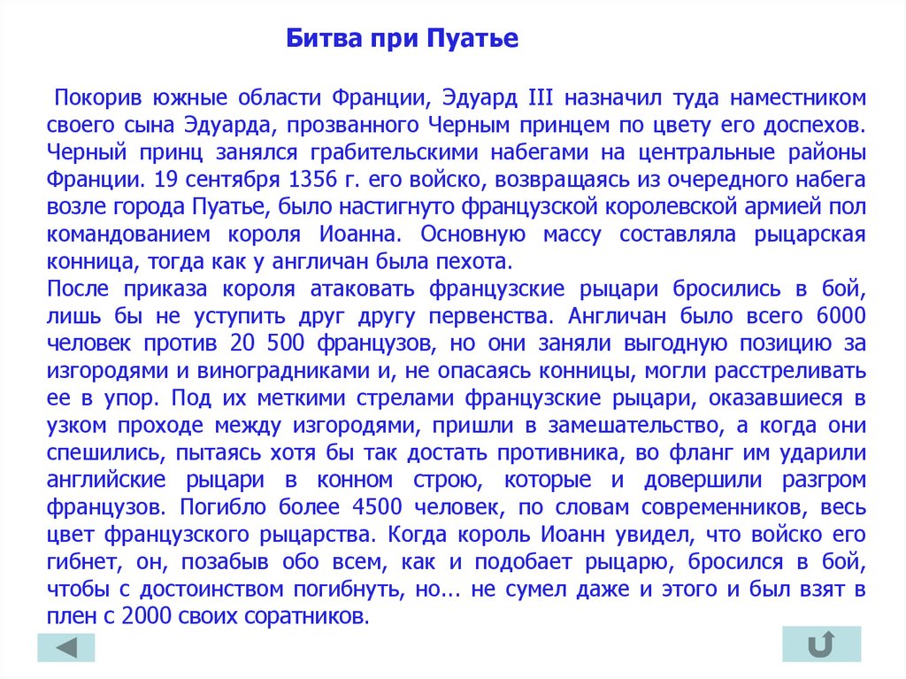 Текст «Битва при Пуатье»«Англичане образовали два крыла из своих стрелков из лука по бокам своей боевой линии и