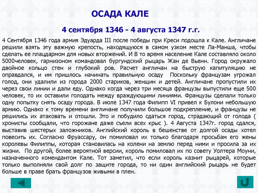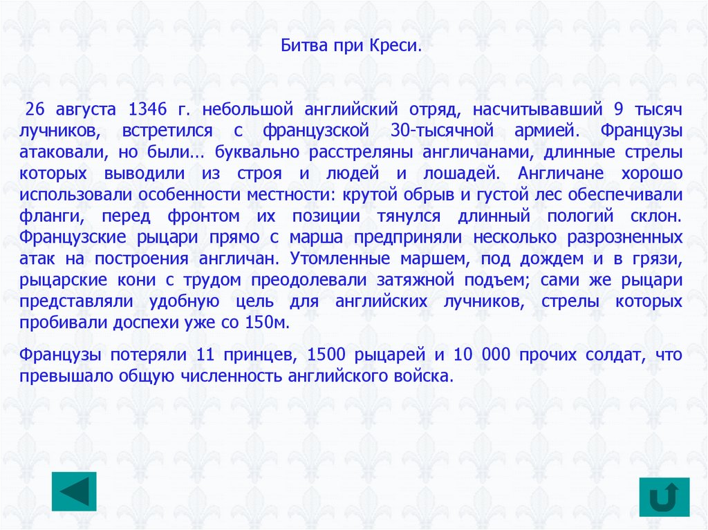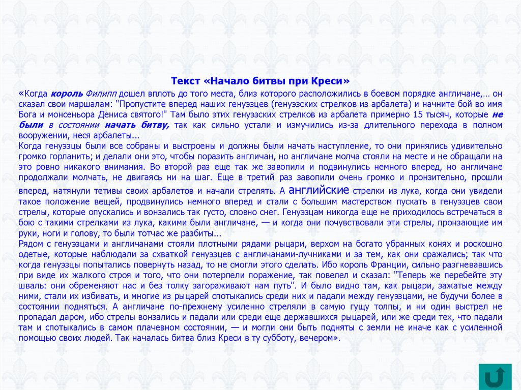 Текст «Начало битвы при Креси»«Когда король Филипп дошел вплоть до того места, близ которого расположились в боевом порядке англичане,… он