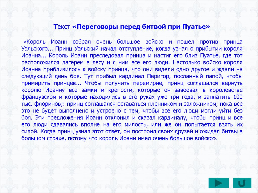 Текст «Переговоры перед битвой при Пуатье»«Король Иоанн собрал очень большое войско и пошел против принца