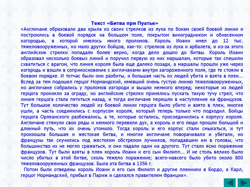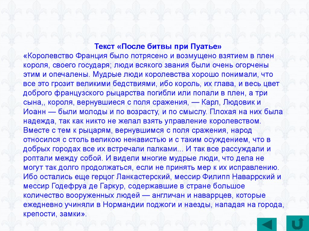 Текст «После битвы при Пуатье»«Королевство Франция было потрясено и возмущено взятием в плен
