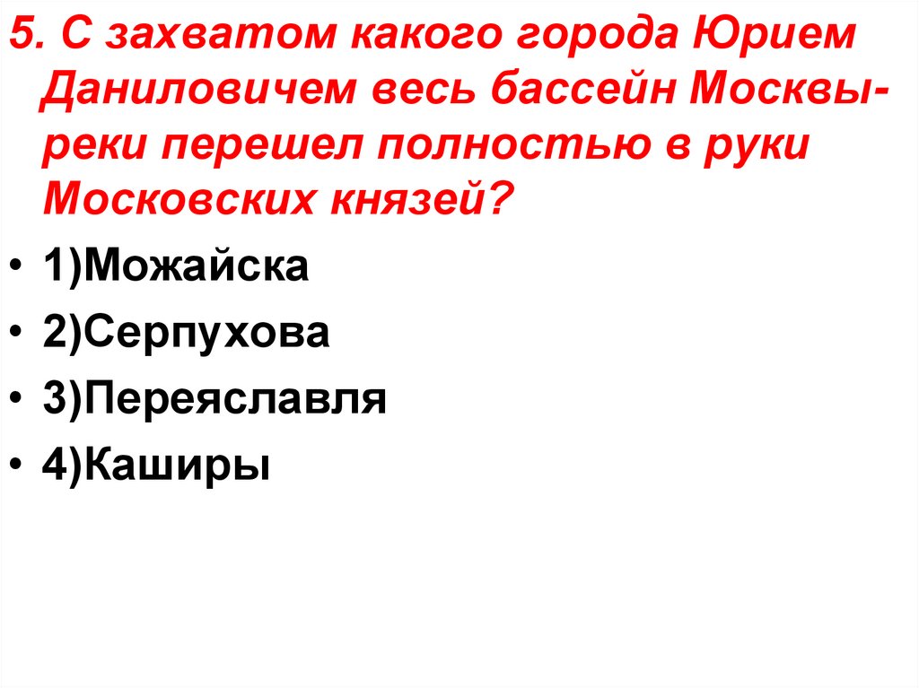 5. С захватом какого города ЮриемДаниловичем весь бассейн Москвыреки перешел полностью в руки