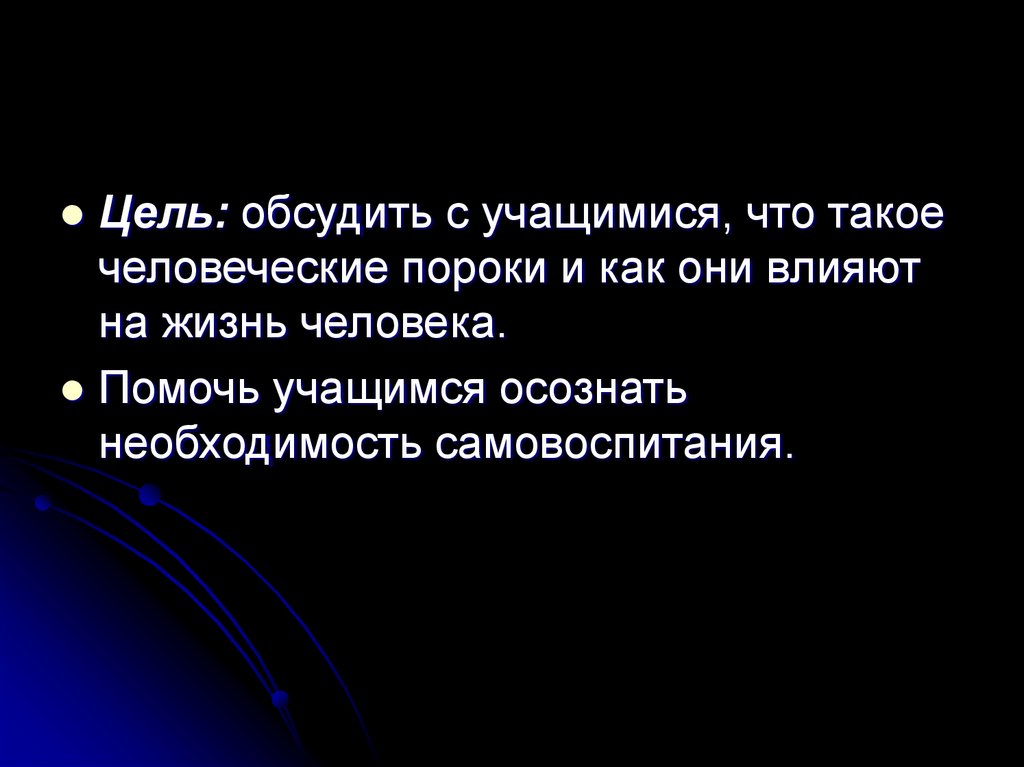 Цель: обсудить с учащимися, что такоечеловеческие пороки и как они влияют