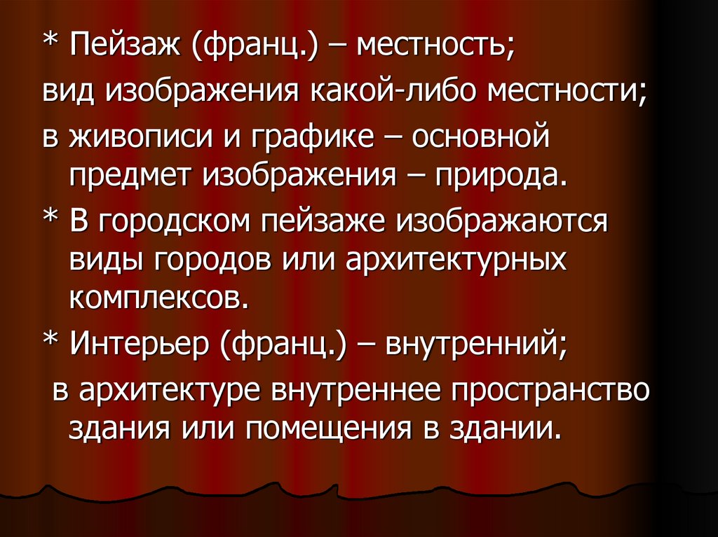 * Пейзаж (франц.) – местность;вид изображения какой-либо местности;