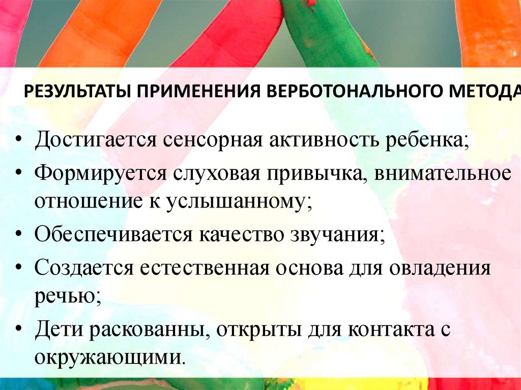 РЕЗУЛЬТАТЫ ПРИМЕНЕНИЯ ВЕРБОТОНАЛЬНОГО МЕТОДА• Достигается сенсорная активность ребенка;