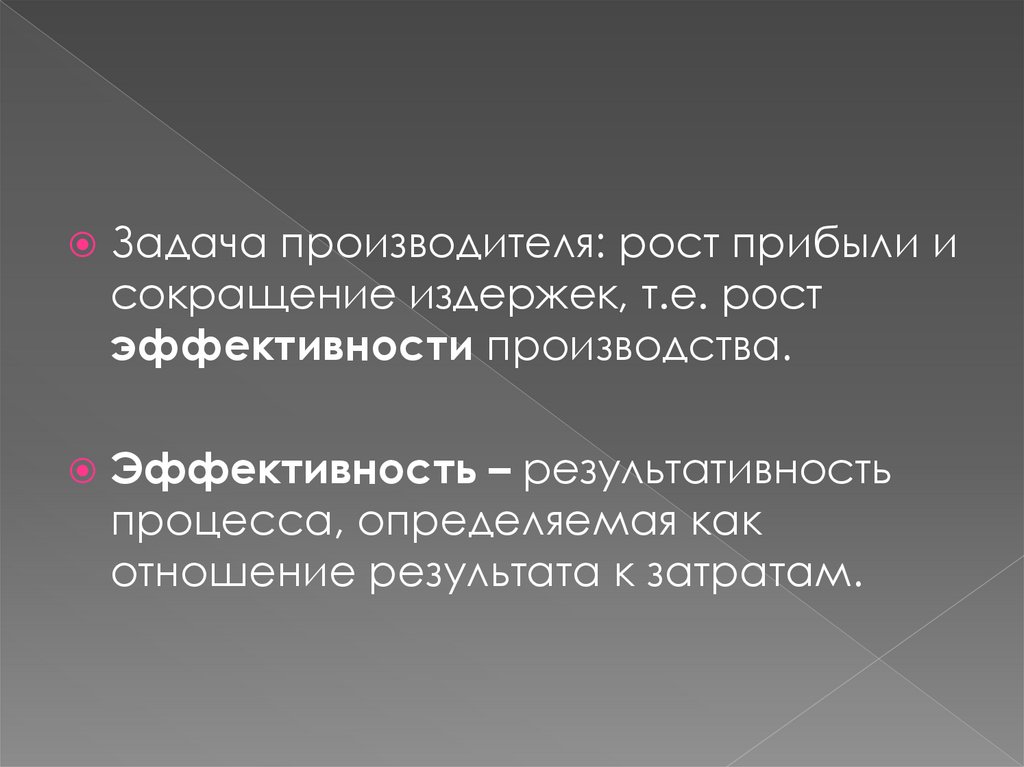 Задача производителя: рост прибыли исокращение издержек, т.е. рост