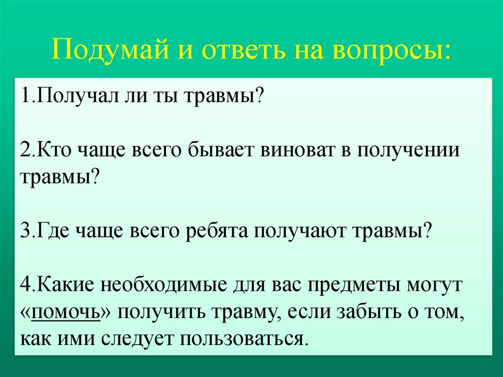 1.Получал ли ты травмы?2.Кто чаще всего бывает виноват в получении