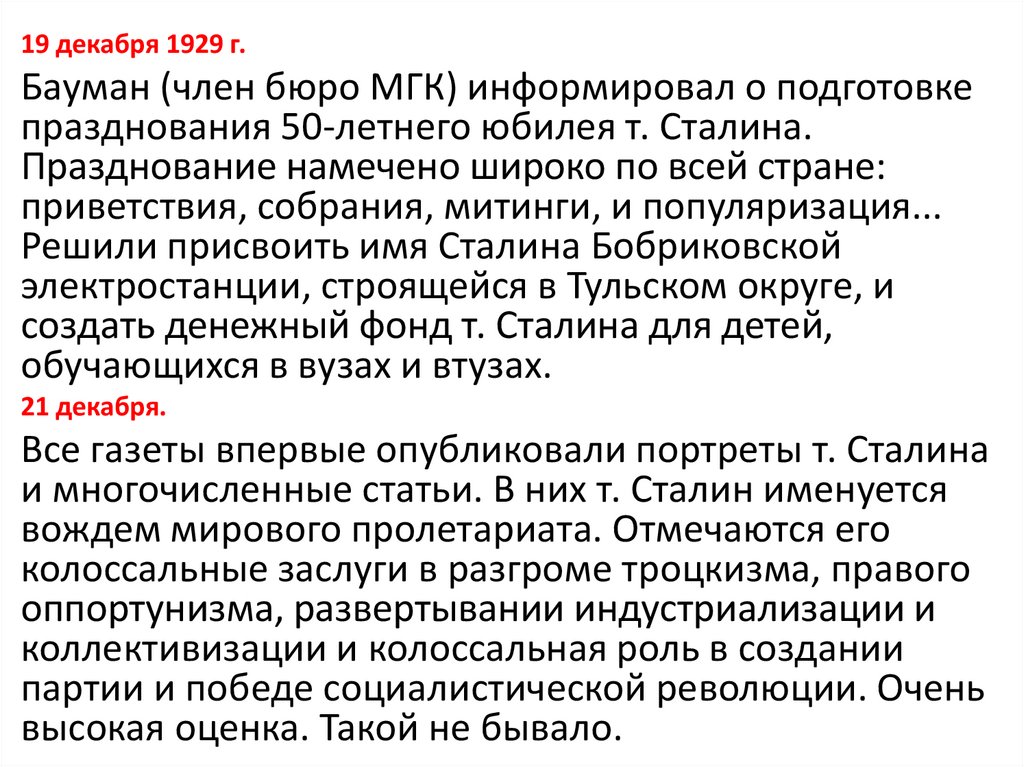 19 декабря 1929 г.Бауман (член бюро МГК) информировал о подготовке