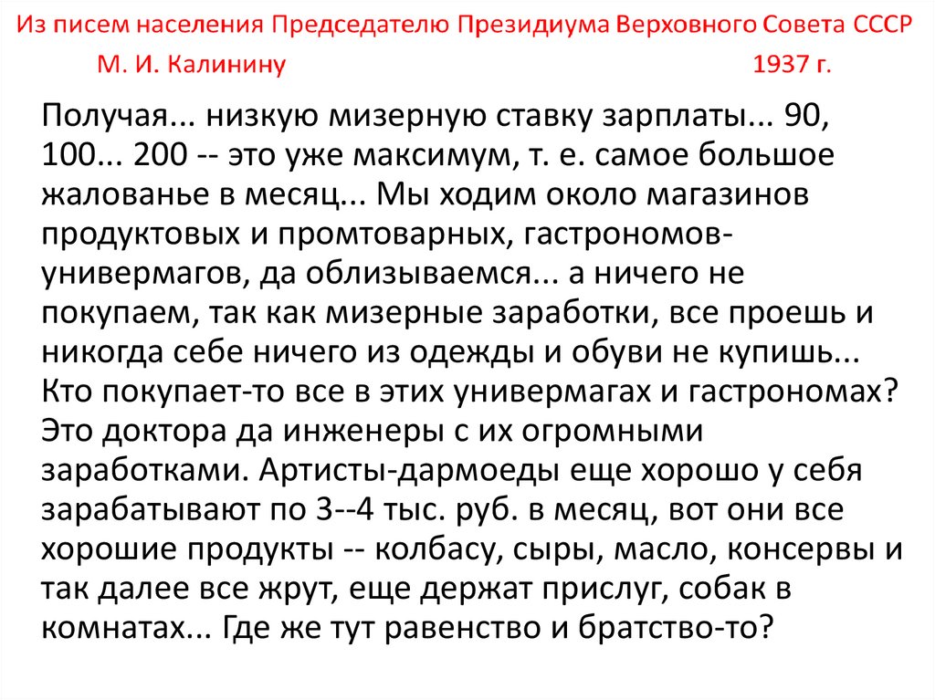 Из писем населения Председателю Президиума ВерховногоСовета СССР М. И. Калинину