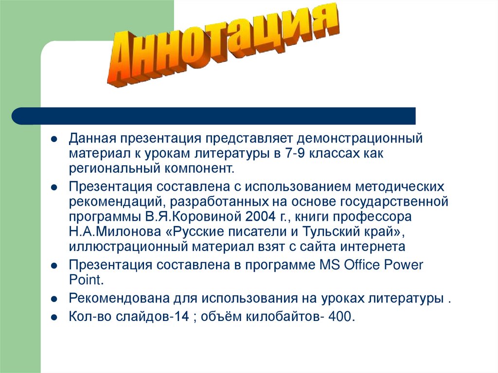 Данная презентация представляет демонстрационныйматериал к урокам литературы в 7-9 классах как