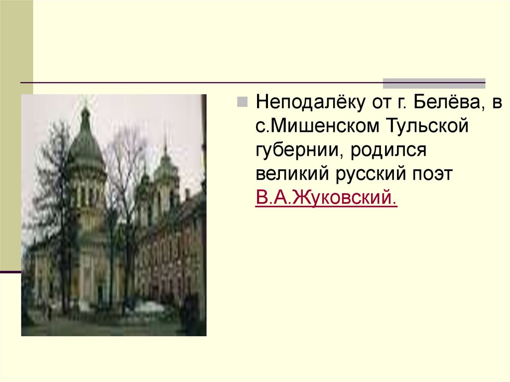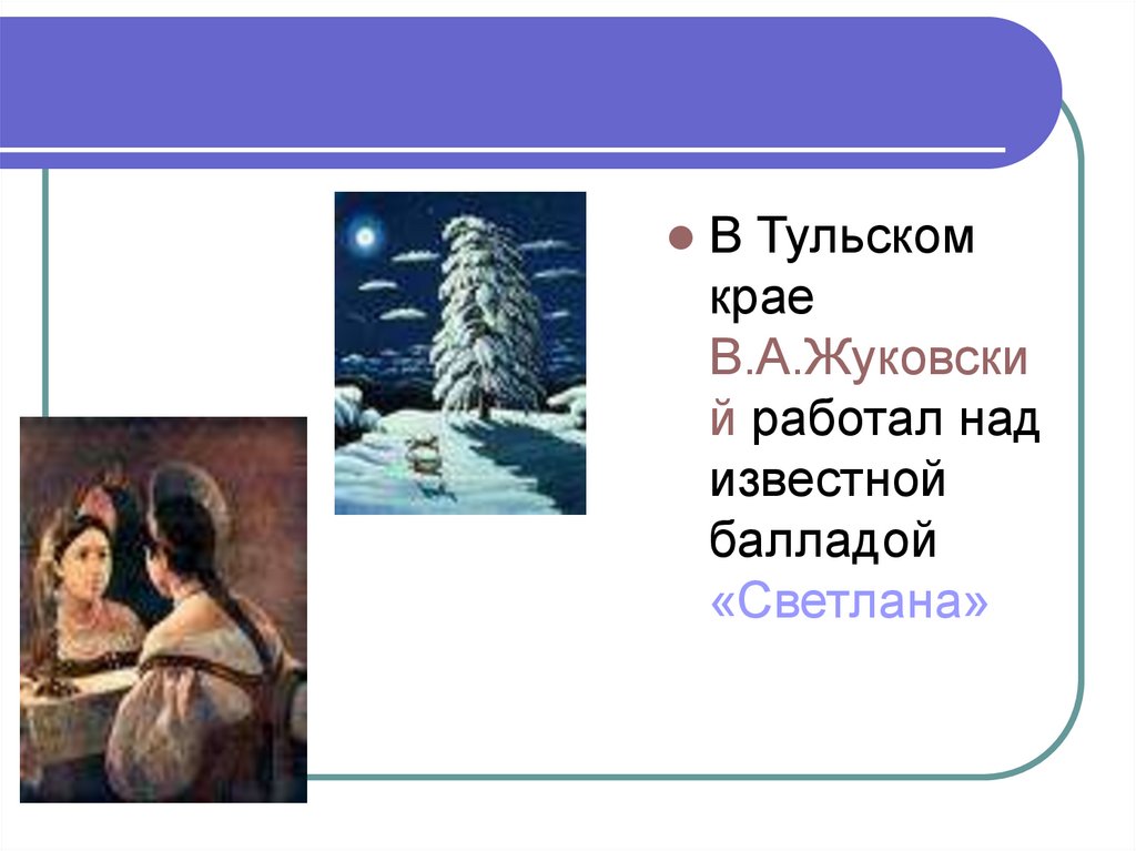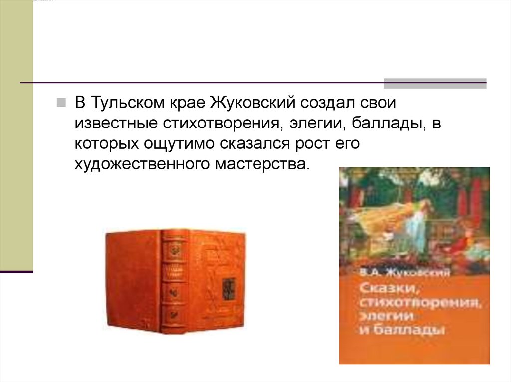 В Тульском крае Жуковский создал своиизвестные стихотворения, элегии, баллады, в