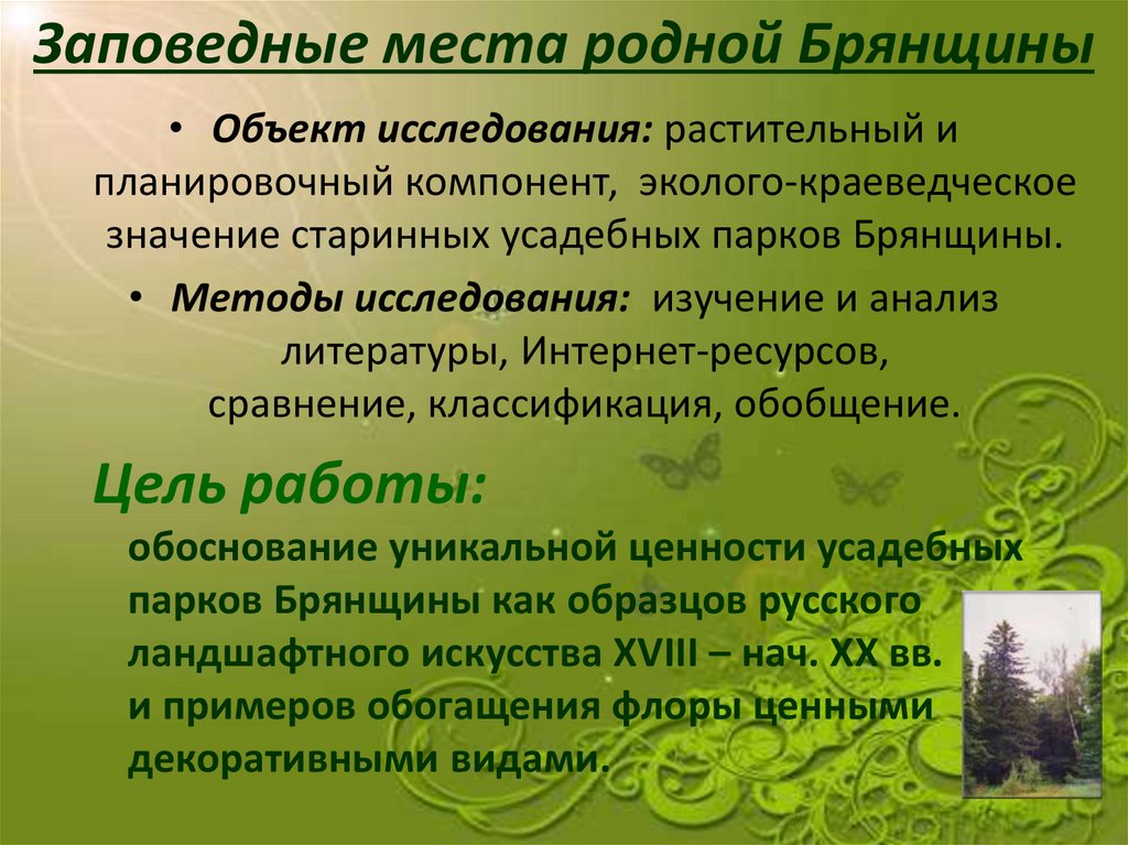 Заповедные места родной Брянщины• Объект исследования: растительный и