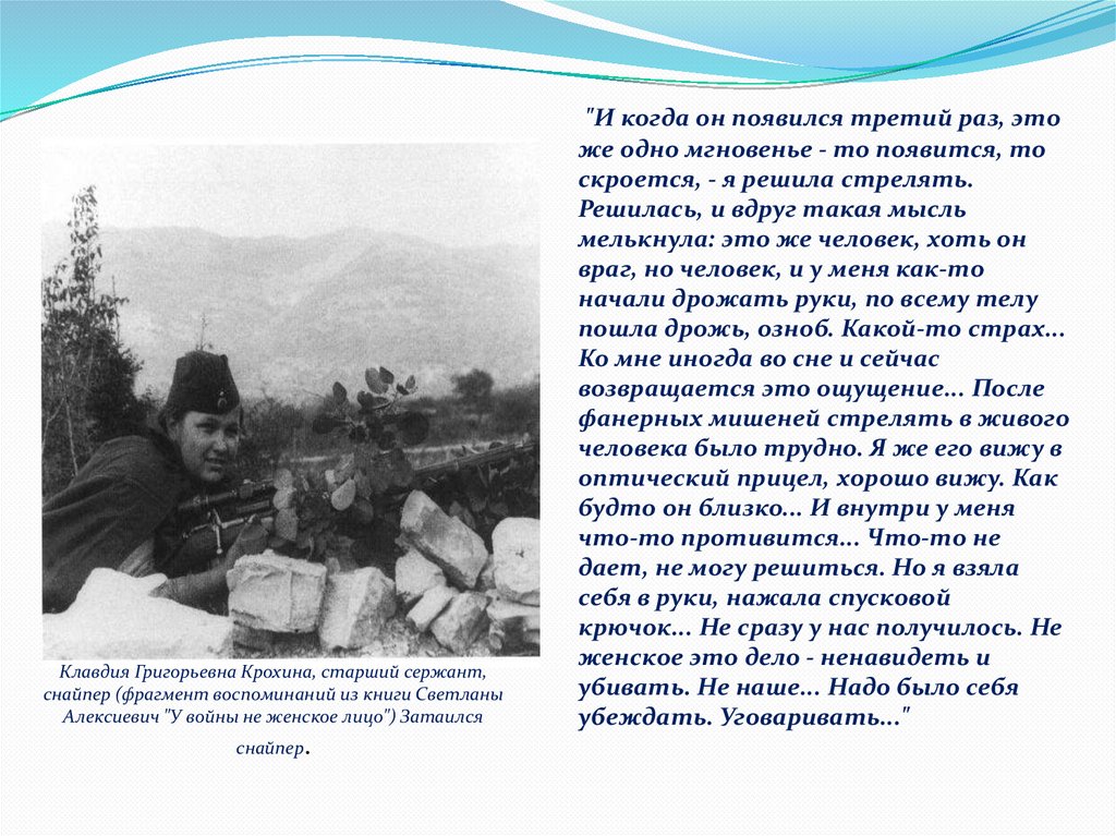Клавдия Григорьевна Крохина, старший сержант,снайпер (фрагмент воспоминаний из книги Светланы