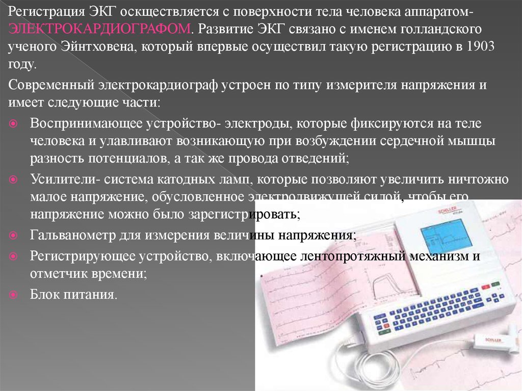 Регистрация ЭКГ оскществляется с поверхности тела человека аппаратомЭЛЕКТРОКАРДИОГРАФОМ. Развитие ЭКГ связано с именем голландскогоученого Эйнтховена, который впервые осуществил такую регистрацию в 1903