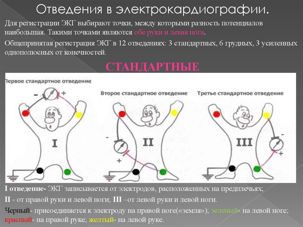 Черный- присоединяется к электроду на правой ноге(«земля»); зеленый- на левой ноге;