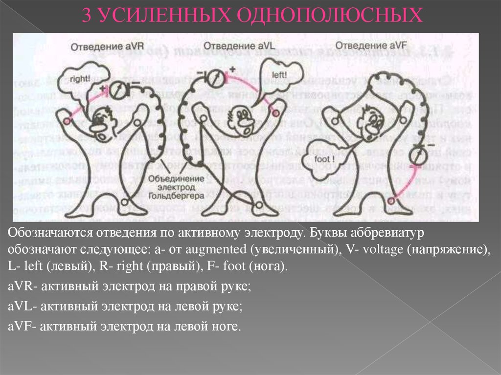 3 УСИЛЕННЫХ ОДНОПОЛЮСНЫХОбозначаются отведения по активному электроду. Буквы аббревиатур