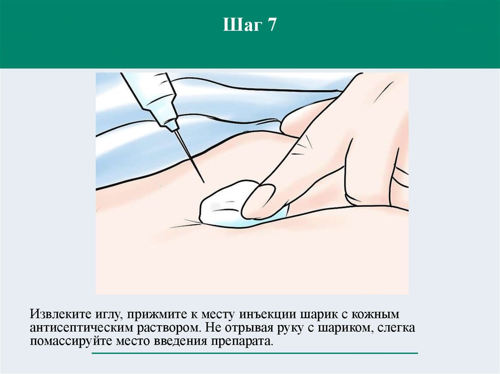 Шаг 7Извлеките иглу, прижмите к месту инъекции шарик с кожным