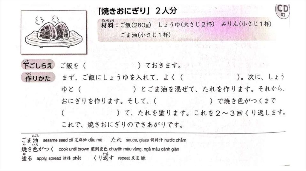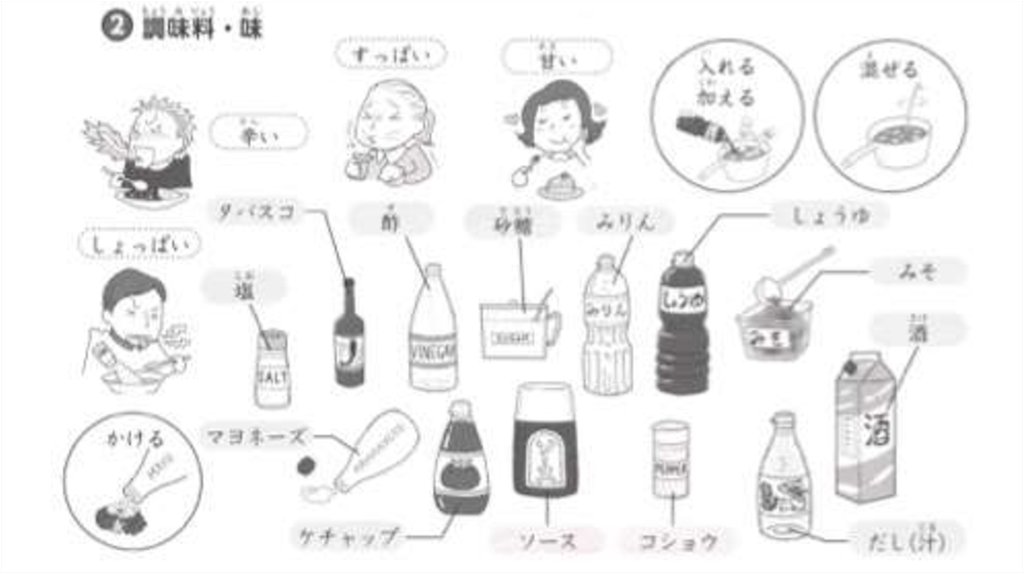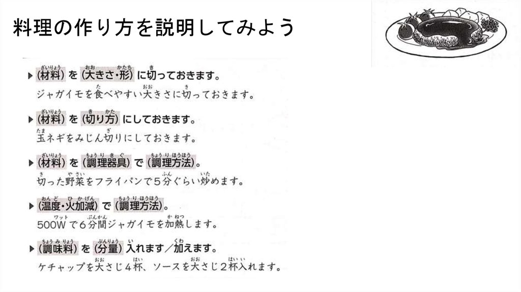 1課 電子レンジでチンする - 料理 2課 寒気がする - 病気・症状 3課 カジュアルな感じ - 服選び 4課 発想力が豊か - 性格 5課 2LDKの高層マンション - 家探し 6課 価値観が合う人 - 結婚 7課 桜が舞う - 季節 -8課 猫の手も借りたい - 慣用句・ことわざ 9課 富士山 - 世界遺産・名所紹介 10課 50%を占めている - グラフ -