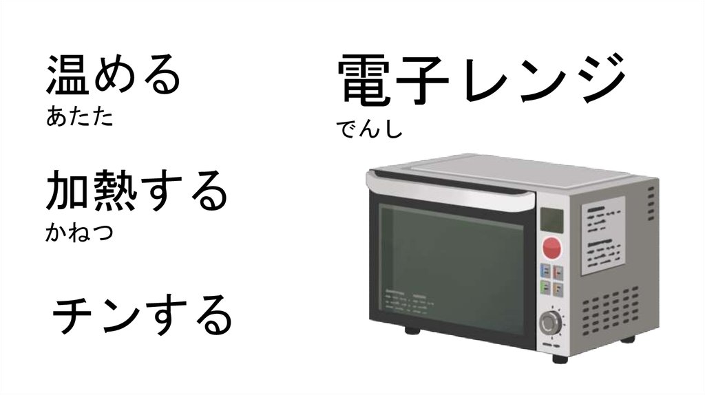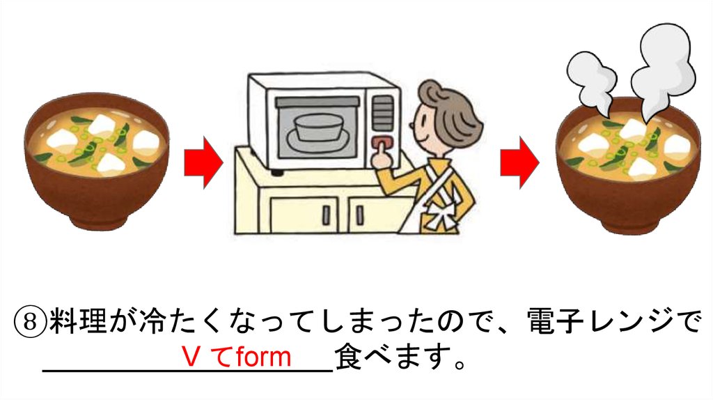 ⑧料理が冷たくなってしまったので、電子レンジで温めて・加熱して・チンして食べます。