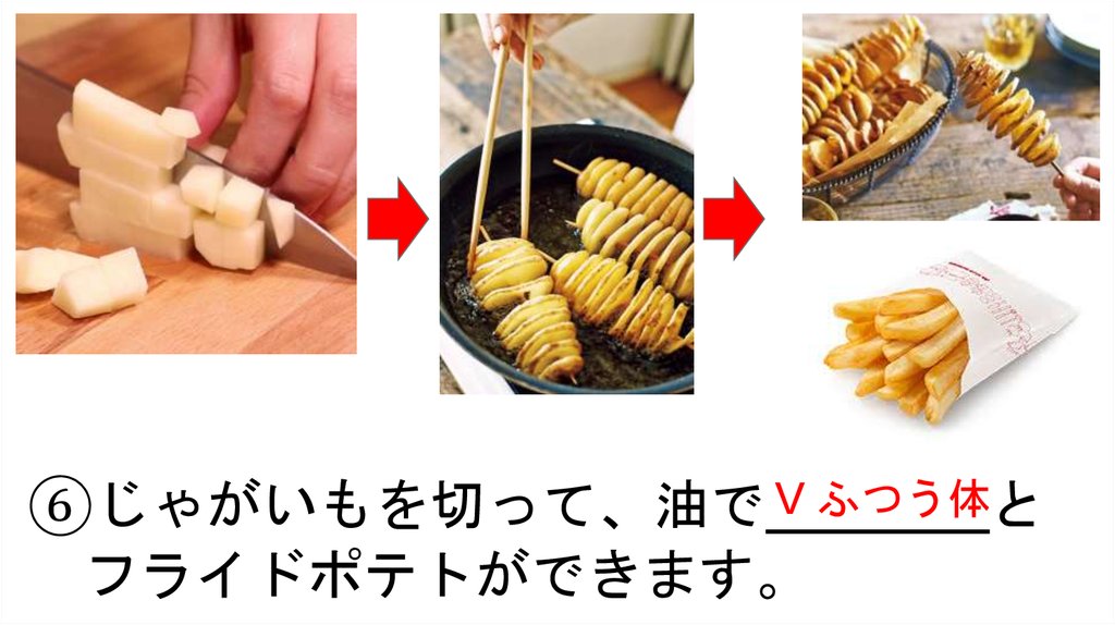 ⑥じゃがいもを切って、油で V ふつう体とフライドポテトができます。